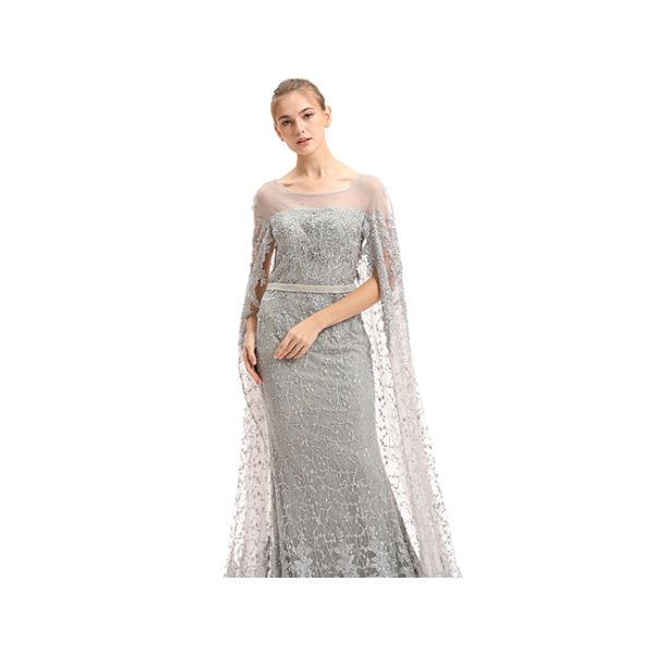 Embroidery Lace Muslim Evening Dress With Long Cape / Grey Prom Dress Images |
