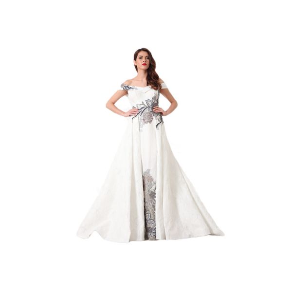 Elegant White Embroidery Design Women Long Wedding Dresses Off The Shoulder Muslim Dress